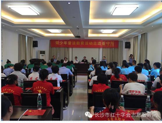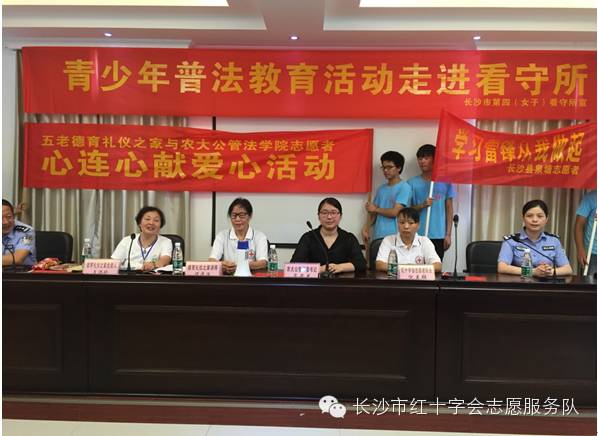 2015年7月21日上午,长沙县红十字会志愿队倪美群队长和优秀“五老”志愿者文池珍阿姨组织泉塘街道小塘路社区的红十字会志愿者及湖南农业大学公管法学院志愿者一起走进了长沙市第四(女子)看守所,举行了“心连心·献爱心”志愿活动及普法教育活动。