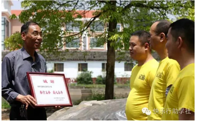 阳光心翼家园赵曙院长(左一)给湾田物流车队送上“诚谢”奖牌