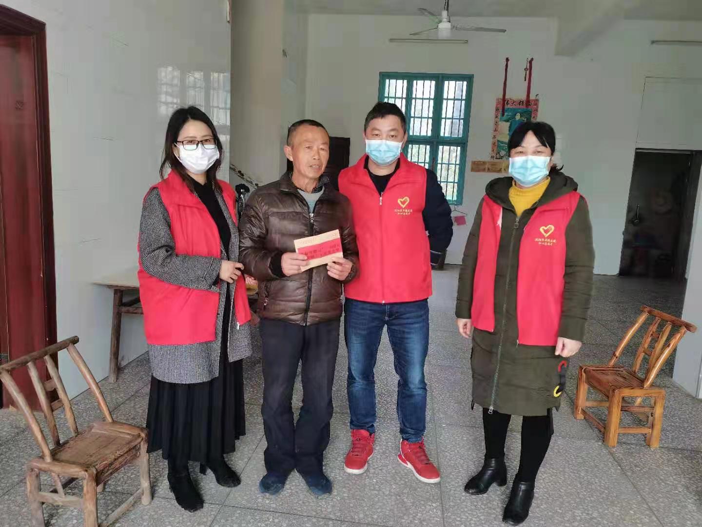 为大力弘扬“奉献、友爱、互助、进步”的志愿服务精神,传播党的声音,向社会传递温暖。2月8日,枨冲镇卫生院志愿者服务队在院党委书记谭文新院长地带领下,来到了因病致贫的群众家中开展春节慰问志愿服务活动。志愿者们与贫困群众面对面深入谈心,详细询问他们的生活情况和身体健康状况,叮嘱他们要注意防寒保暖,注意低温天气的取暖用电用火用气安全。宣传新冠肺炎的防控知识,戴口罩,少聚会。祝福他们早日康复,过一个温馨、祥和、如意的新春佳节。